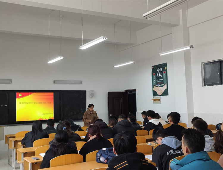2021年3月8日,中午12:30,体育学院学生党支部全体党员在新馆在A113教室召开了体育学院学生党支部组织生活会。会议由体育学院学生党支部书记田慧丽主持,白明院长指导,全体学生党员参加会议。