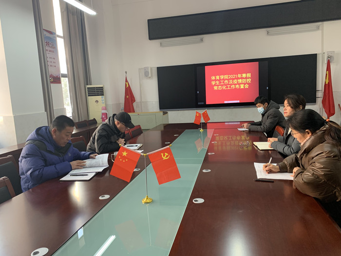 寒假将至,疫情防控形势依然不容乐观,为做好寒假期间疫情防控和学生管理工作,1月11日体育学院组织召开了2021年寒假学生工作及疫情防控常态化工作布置会,会议由体育学院党委书记宋红军主持,体育学院党委委员和全体辅导员参加了会议。