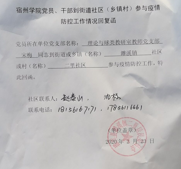 在宿州市银河社区招募志愿者时,体育学院王明和张开媛老师就第一时间递交了申请表,并光荣地成为了一名社区志愿者,宋梅老师积极参加淮北市濉溪镇二里社区的疫情防控志愿工作,在疫情期间,为保障社区人民的安全和健康奉献着自己的一份力量。