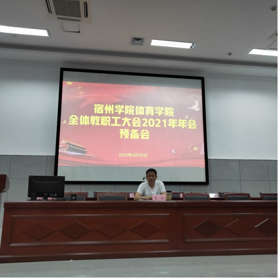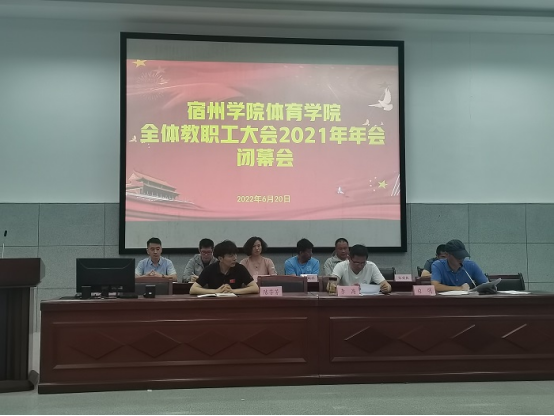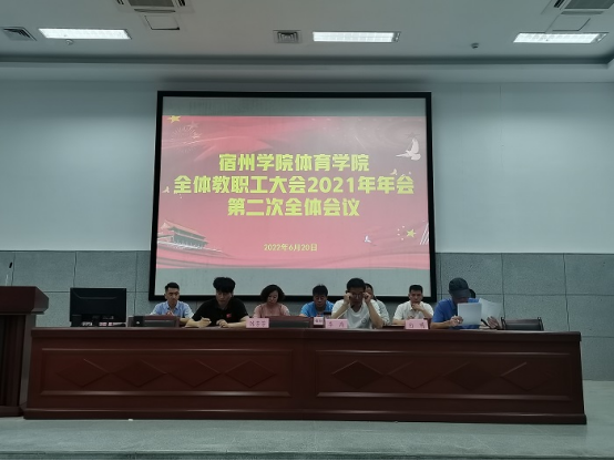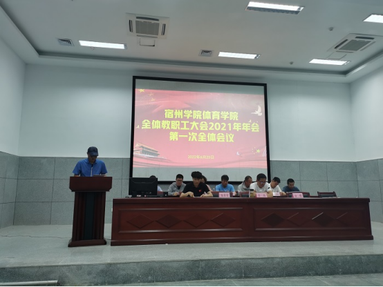2022年6月20日上午9时,宿州学院体育学院教职工大会2021年年会在体育馆报告厅开幕。体育学院全体教职工参加会议,会议由党委书记李高主持。