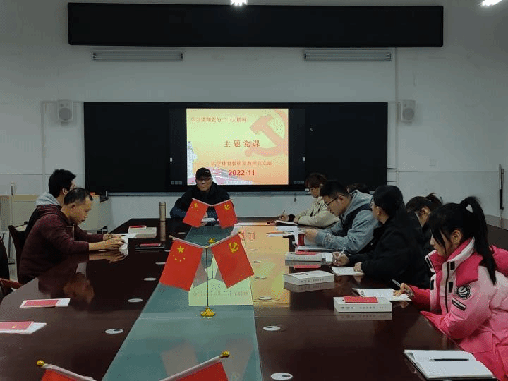 为深入学习宣传贯彻党的二十大精神,11月28日中午,体育学院党委副书记、院长白明到大学体育教研室教师党支部讲授学习贯彻党的二十大精神的专题党课,会议由支部书记涂芙蓉主持,全体党员参加。