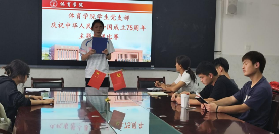为庆祝中华人民共和国成立75周年,弘扬爱国主义精神,传承红色基因,2024年9月26日,体育学院学生党支部开展庆祝中华人民共和国成立75周年朗诵比赛主题党日活动。