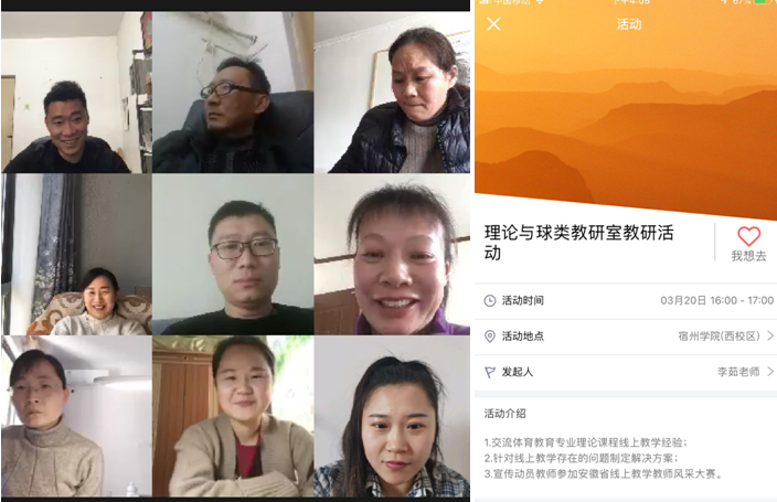 3月20日下午,理论与球类教研室开展“守教育初心,担抗疫使命” 为主题的教研室活动。本次活动充分利用“微信视频会议”、 “QQ群活动”形式进行。活动内容主要包括三项:1、学习习近平总书记在“统筹推进新冠肺炎防控和经济社会发展工作部署会议”;2、体育教育专业理论课程网上教学经验交流;3、动员教师参加《安徽省疫期线上教学教师风采大赛》和《2020年度重大线上教学改革研究项目》申报工作。