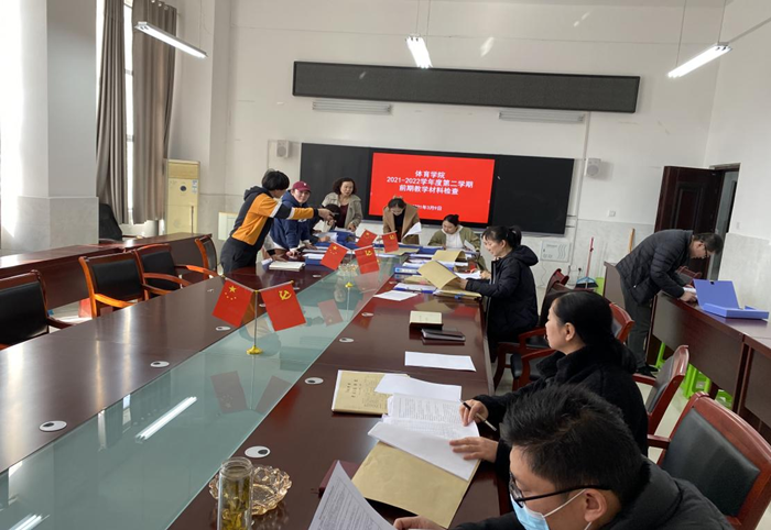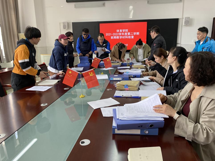 为更好的开展新学期教学工作,加强本院教学工作的过程管理,规范教师的教学行为,强化教师教学的责任意识,进一步提高教师做好教学常规工作的积极性和自觉性。3月9日下午2点,体育学院在体育馆会议室A104开展了2021-2022学年度第二学期教学材料大检查工作,体育学院党委副书记、院长白明,校教学督导委员会委员王瑞芳,教学副院长陈芳芳,院教学督导组全体成员,各教研室主任,教学秘书,教务员等参与了检查。