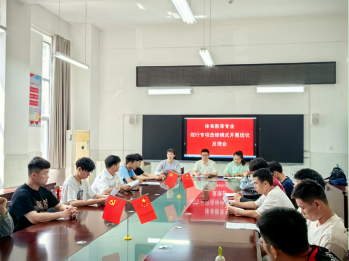 为更好地开展体育学院专业选修课程,达到体育各专业的认证和评估要求,提高专业选修课程的教学效果,体育教育教研室于5月24日中午1点举办了“体育教育专业现行专项选修模式开展现状反馈会”,参加会议的有院教学督导组代表李茹、教研室主任徐光辉、教研室副主任宋梅、2019级-2022级各班级班长、学习委员及学生代表,会议由教研室主任徐光辉主持。