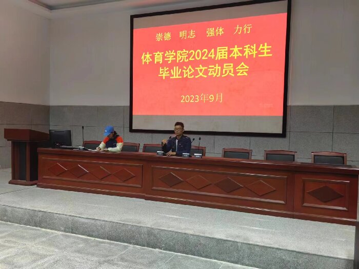 为有效落实宿州学院本科毕业论文工作,培养学生综合运用专业知识的能力,促进毕业生的毕业论文设计进程。体育学院于9月6日在体育馆多功能报告厅召开2024届本科毕业论文动员会。体育学院教学秘书刘海龙、分管论文教务员陈欢欢、毕业论文导师和2024届毕业生参加大会,会议由刘海龙主持。