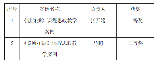 2023年12月1日宿州学院课程思政优秀教学案例评选结果揭晓,体育学院休闲体育专业教师张开媛老师荣获一等奖,马超老师荣获三等奖。