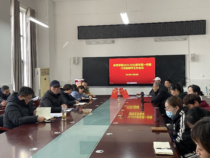 12月20日,体育学院在会议室A104召开12月份教学工作会议,体育学院党委书记李高,党委副书记、院长白明,教学副院长陈芳芳及全体教职工参加会议。会议由体育学院党委书记李高主持。