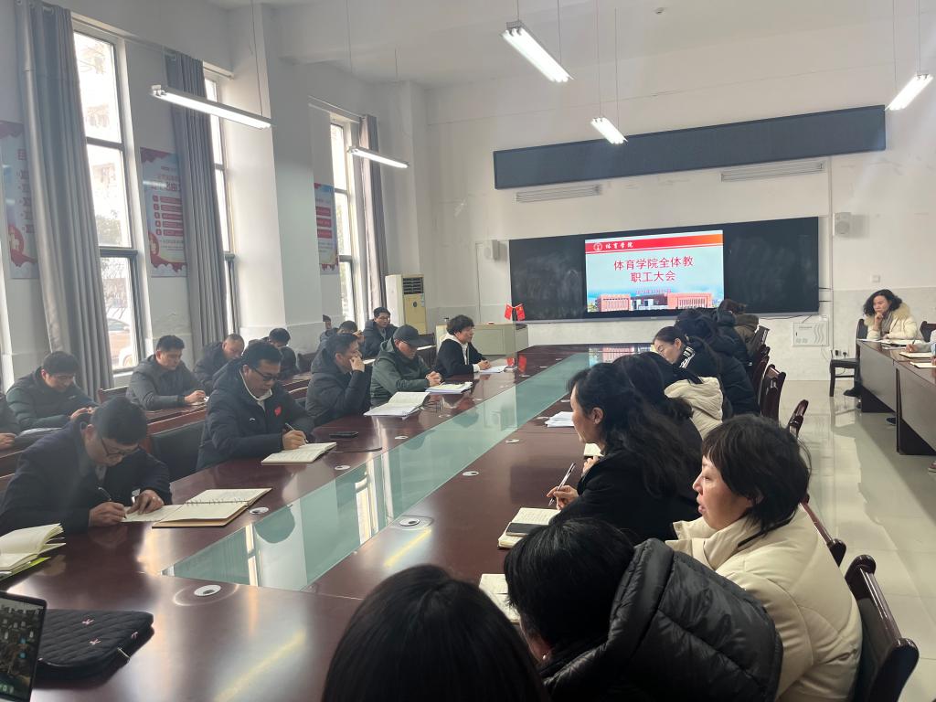 12月25日,体育学院在会议室A104召开全体教职工大会,学院党委书记李高,党委副书记、院长白明,副书记兼纪委书记王德玉,副院长陈芳芳和全体教职工参加会议,会议由白明主持。
