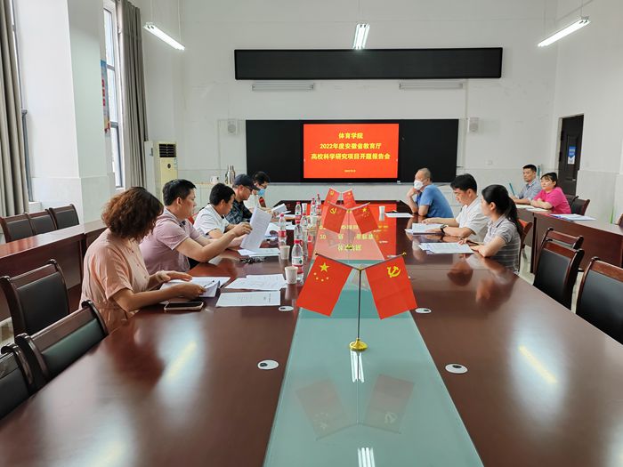 根据学校工作部署,按照科研处的统一安排和要求,为进一步推进2022年度安徽省教育厅高校科学研究项目的顺利实施,体育学院于5月18日在体育馆A104会议室举行了“2022年度安徽省教育厅高校科学研究项目开题报告会”。会议邀请淮北师范大学体育学院副院长陈威教授,宿州学院体育学院党委书记李高,党委副书记、院长白明,体育教育教研室主任徐光辉、大学体育教研室主任刘娟、休闲体育教研室主任刘明龙担任评审专家,对体育学院3个项目(1项重大、2项重点)进行开题评审,会议由白明主持。