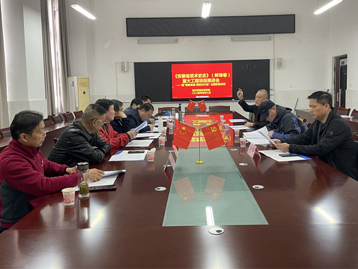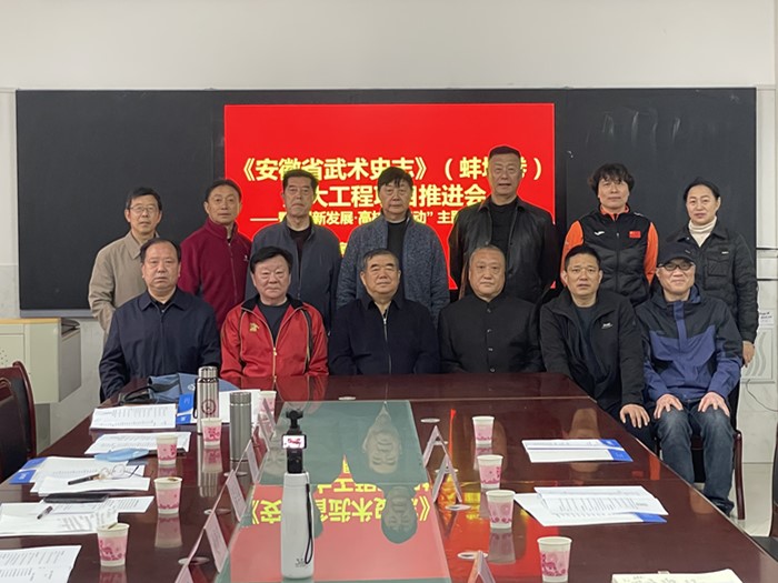 4月3日上午,体育学院在A104会议室举办“创新发展•高校在行动”主题实践活动——《安徽省武术史志》(蚌埠卷)重大工程项目推进会。安徽省武术协会名誉主席、蚌埠市武术协会主席赵新民,安徽省武术协会副主席、蚌埠市武术协会副主席、秘书长梁文成,安徽省武术协会顾问,原蚌埠市武术协会主席梁红宣,安徽省武术协会名誉副主席、五河县武术协会主席陈复强,蚌埠市武术协会常务副主席陈培海,蚌埠市武术协会副主席赵辉,蚌埠市武术协会副主席殳元武,蚌埠市武术协会副秘书长付长礼以及体育学院党委书记李高、党委副书记院长白明、副院长陈芳芳、项目主持人杨维教授等出席会议。
