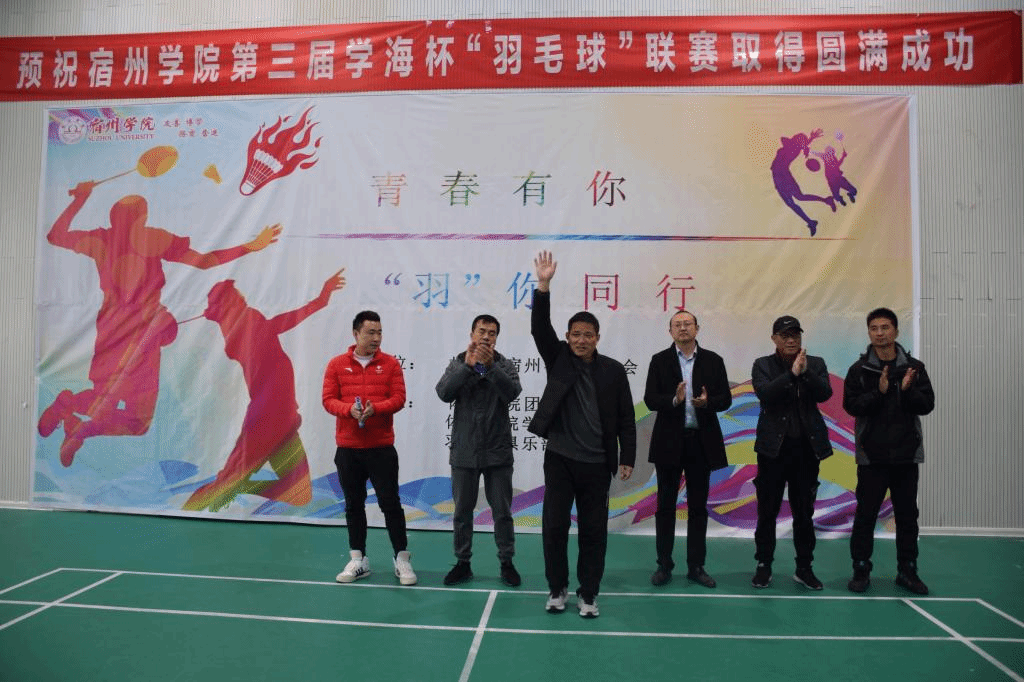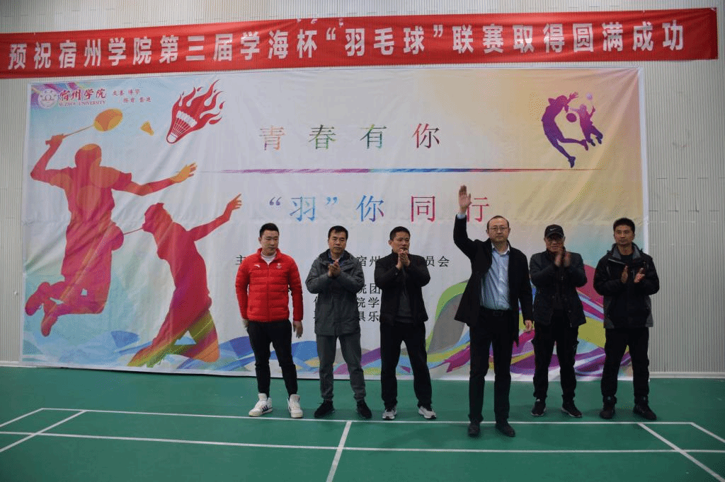 传承体育精神,共享羽球魅力。为丰富大学生的课余文化生活,提高大学生的身体素质,进一步增进同学们的情谊,宿州学院第三届“学海杯”羽毛球联赛开幕式于2021年11月24日中午12时30分在体育学院羽毛球场举行,参加本次开幕式的有宿州学院校团委凌峰、体育学院党委书记李高、体育学院院长白明、体育学院党委副书记王德玉、体育学院团委书记胡杰、裁判长庄全以及各学院参赛代表队。