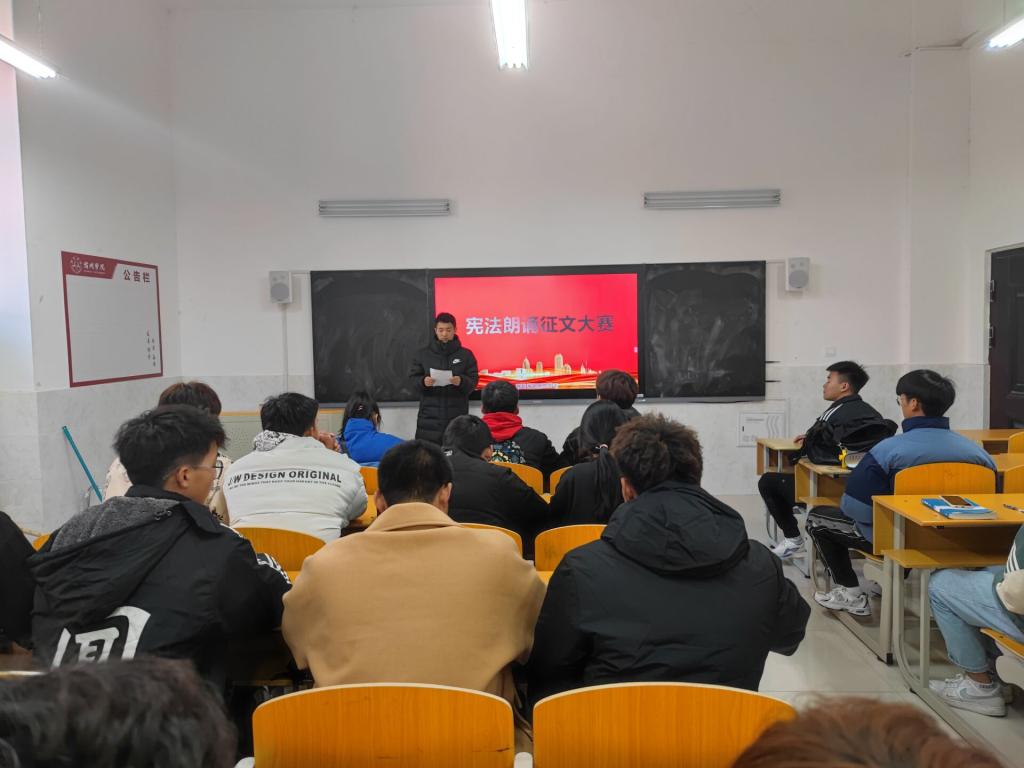 为贯彻落实党的十八大精神、传播法治理念,增强全民法治观念,推进法治社会建设,迎接“国家宪法日”,12月4日下午13点30分在体育学院A109开展宪法朗诵征文比赛,参加此次宪法朗诵征文比赛活动的人员有体育学院学生会主席团、各部门负责人以及干事。