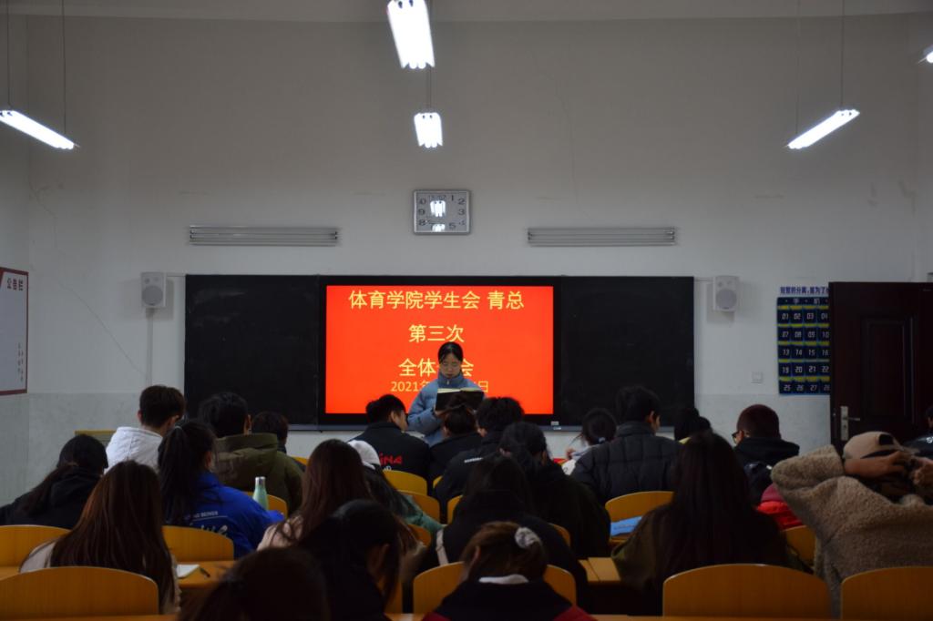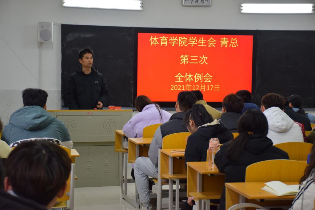 在2021至2022学年即将结束之际,体育学院学生会于2021年12月17日中午12点在体育学院A113教室召开了体育学院学生会、青总第三次全体工作例会,参加此次会议的有体育学院团委书记胡杰和学生会、青总全体成员,本次会议由学生会主席王艳丽主持。