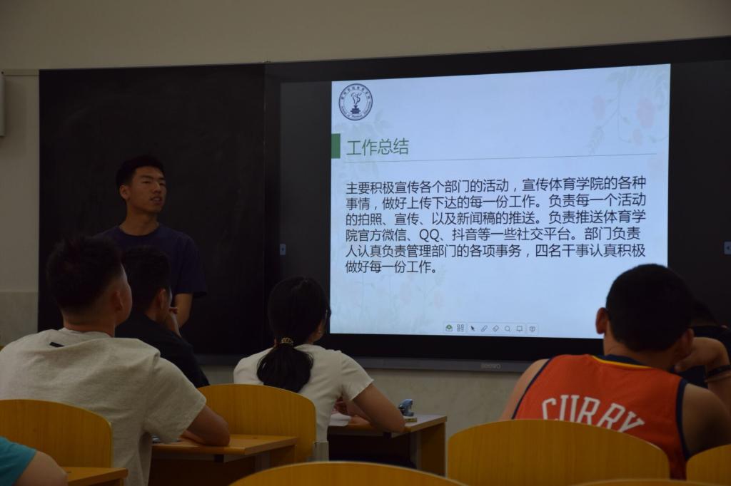 伴随着期末的临近,体育学院学生会脚踏实地、步履坚实的走过了成绩斐然的一年。体育学院于2022年5月19日12点30分在体育馆A109召开2021-2022学年学生会、青总负责人述职报告大会,出席本次会议的有团委书记胡杰以及学生会主席团成员、各部门负责人以及干事。