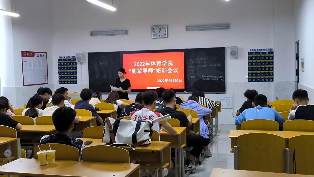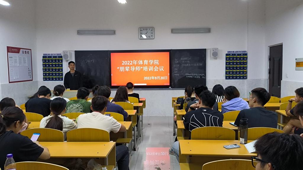 为充分发挥高年级优秀学生在思想引领、学习科研、社会实践等方面的榜样示范作用,协助学院开展新生入学教育,帮助新生尽快适应大学生活。在2022年9月21日13.00在体育学院新馆a109召开2022年体育学院“朋辈导师”培训会议,出席会议的有团委书记胡杰,团副李新燕,体育学院学生中选聘的24名优秀的在校生。