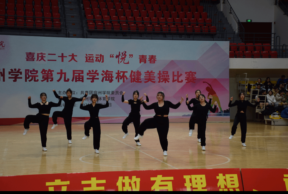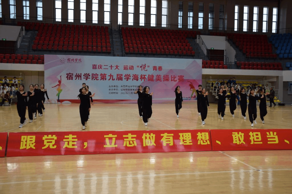 为了锻炼大学生的身体和心理素质,普及健美操知识。由共青团宿州学院委员会举办、宿州学院体育学院承办“喜庆二十大,运动“悦” 青春”为主题的第九届“学海杯”健美操比赛于11月30日在体育学院新馆篮球馆拉开了帷幕,出席本次大赛的有宿州学院校团委书记凌峰、体育学院党委书记李高、院长白明、党委副书记王德玉、校团委组织科科长高歌。团委书记胡杰,担任本次健美操比赛的评委老师的是体育学院健美操专业教师副教授李茹、健美操专业教师副教授郭淑玲、健美操专业教师副教授涂芙蓉、健美操专业教师刘丽、健美操专业教师张开媛以及裁判长李茹。参赛比赛的有学校十四个学院专业组和非专业组健美操队伍以及体育学院专业组健美操队伍。表演队伍是体育学院20体育舞蹈、20休闲体育、22体育舞蹈。