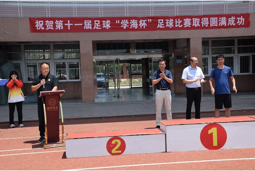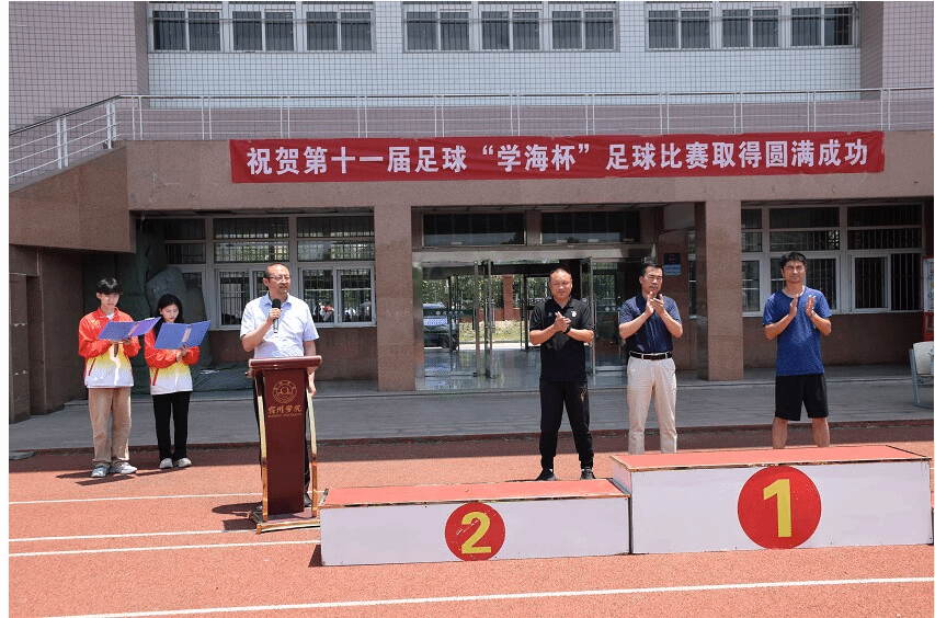 2023年6月14日中午十二点,由校团委、体育学院与校学生会联合承办的宿州学院第十一届“学海杯”足球联赛在足球场圆满落幕。莅临本次闭幕式的领导以及嘉宾有宿州学院团委书记凌峰、宿州学院体育学院党委副书记王德玉、宿州学院体育学院团委书记胡杰、裁判长金国文。