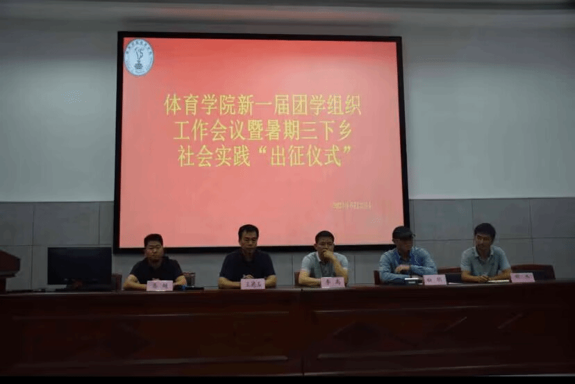 为了进一步促进体育学院团学队伍经验交流,强化团学队伍服务能力,培养同学们的奉献精神和服务社会意识,为以后能更好地适应社会打下坚实的基础和积累丰富的经验,体育学院于2023年6月26日下午4点整在体育学院报告厅召开“体育学院新一届团学组织工作会议暨暑期三下乡社会实践“出征仪式”,出席本次会议的有体育学院党委书记李高,体育学院院长白明,体育学院党委副书记王德玉,体育学院团委书记胡杰,体育学院团委副书记马超,以及体育学院新老学生会、青年志愿总队全体成员、体育学院俱乐部干部。