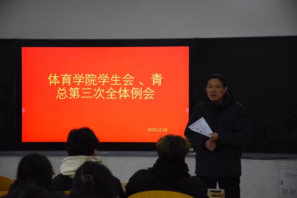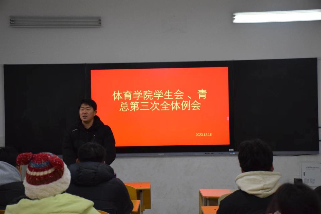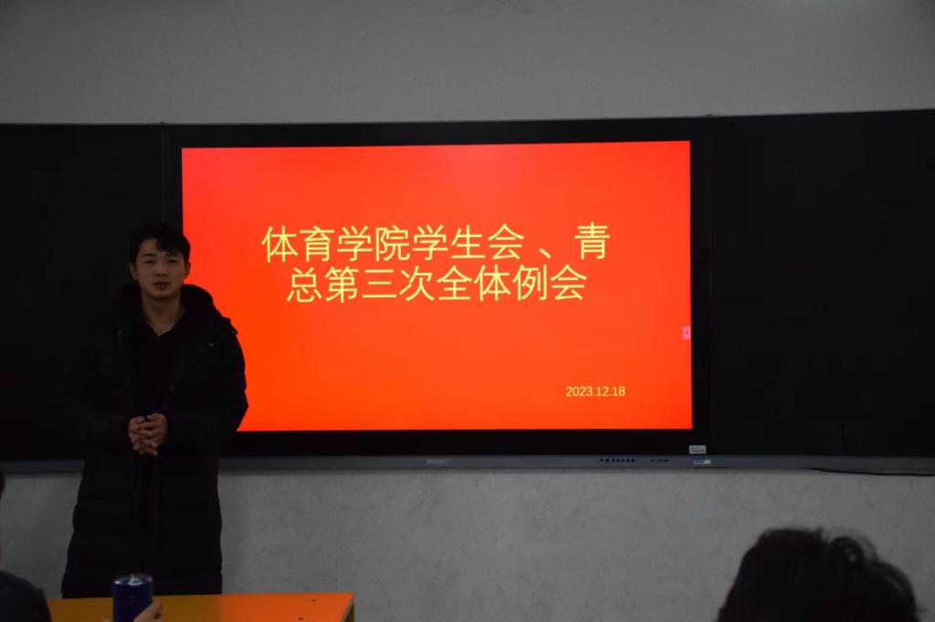初看春花红,转眼已成冬,岁末将至。体育学院于2023年12月18日中午12点在体育学院A113教室举行了体育学院2023年学生会、青年志愿服务总队第三次全体会议,参加此次会议的有体育学院党委书记李高,团委副书记马超,学生会以及青年志愿服务总队全体成员。