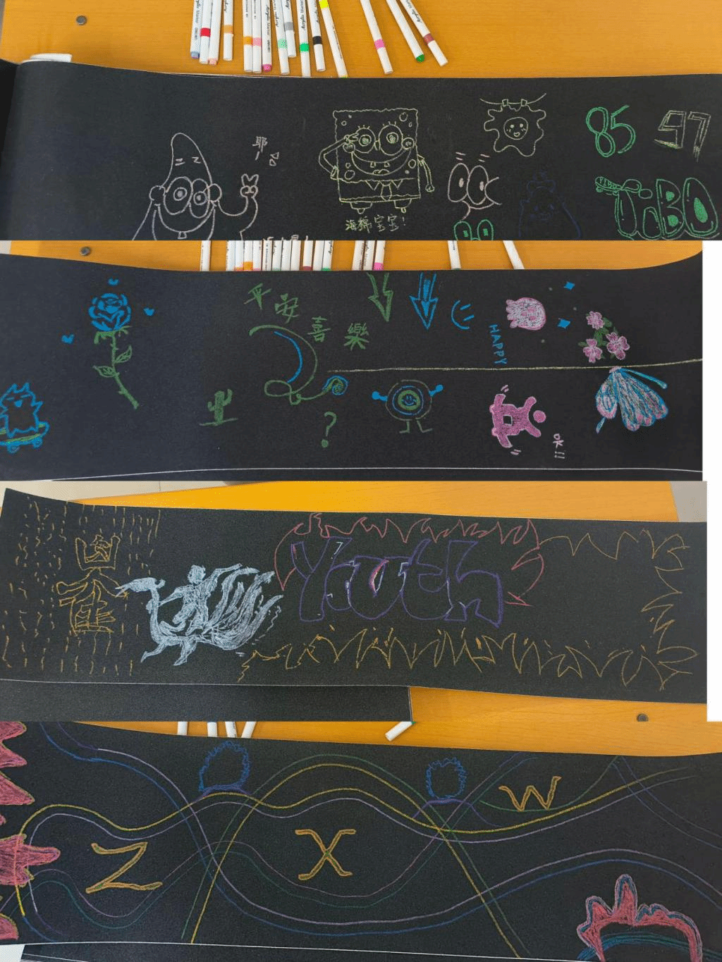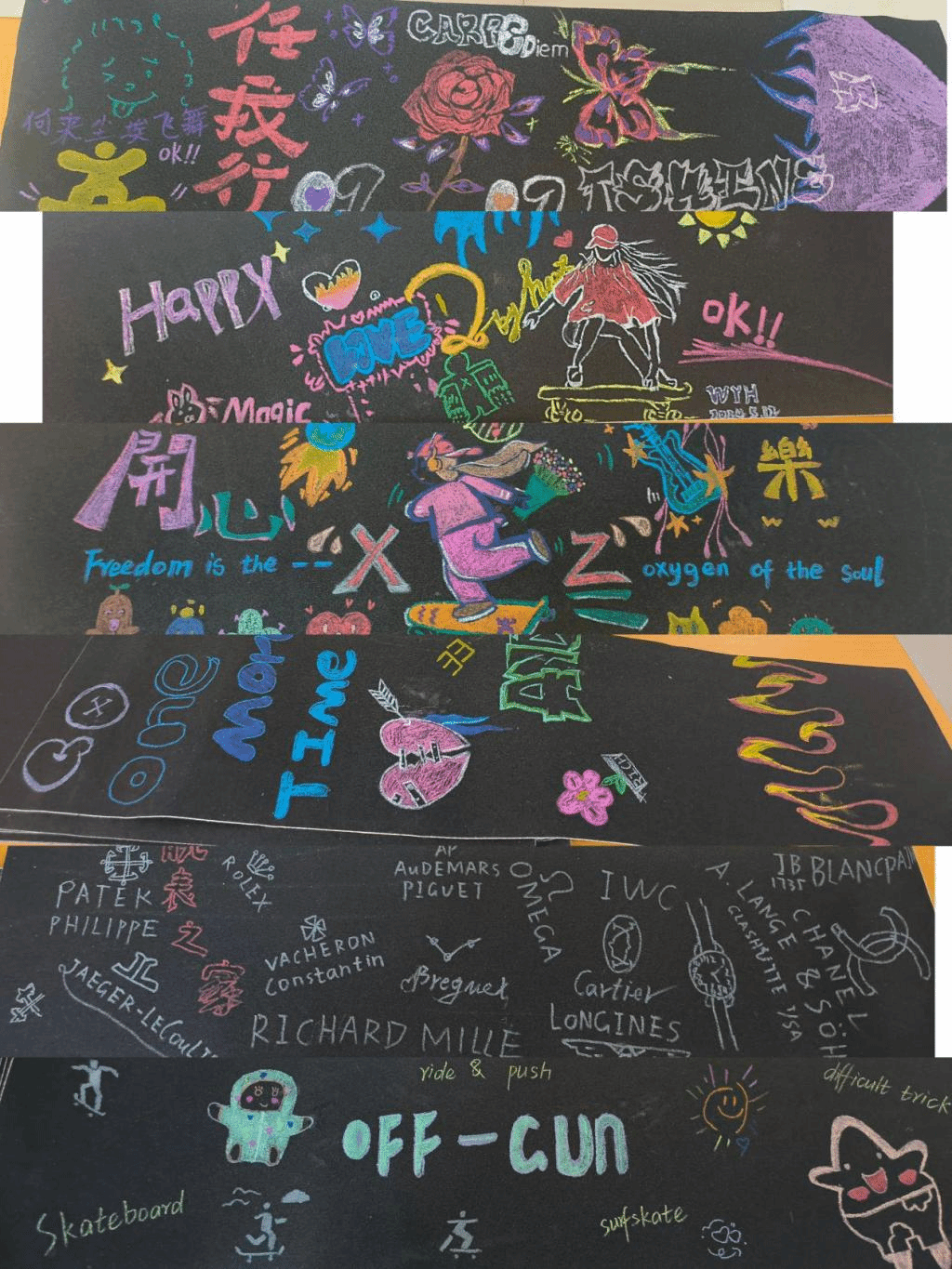 活动现场,由组织者分发砂纸以及画笔,同学们有序借用,开始创作。同学们将自己喜爱的角色,图案,文字用自己的方式画在砂纸上。间接表达了自己对滑板这项运动的喜爱。感谢所有参与者的热情参与,为活动增添了无限生机。