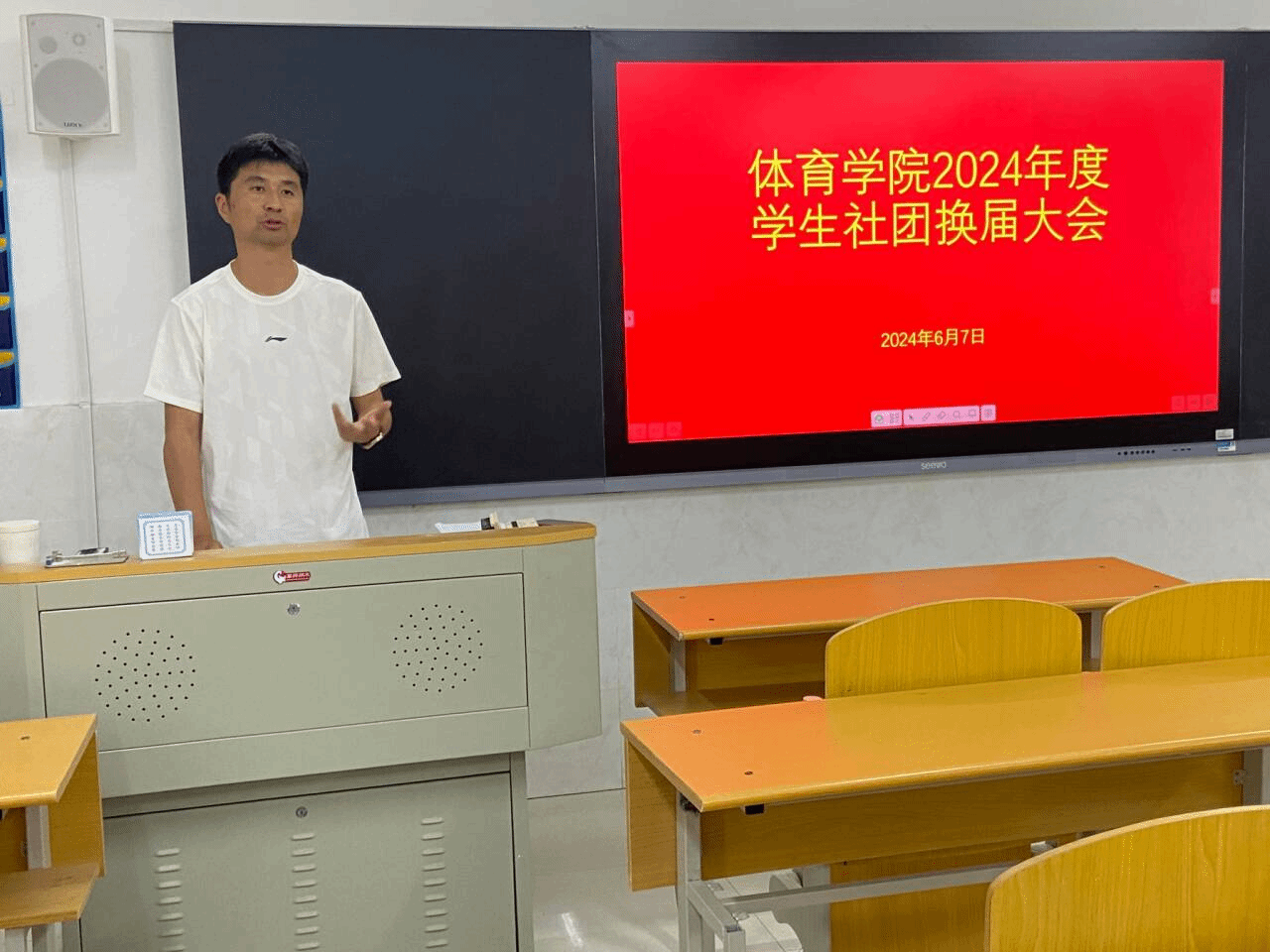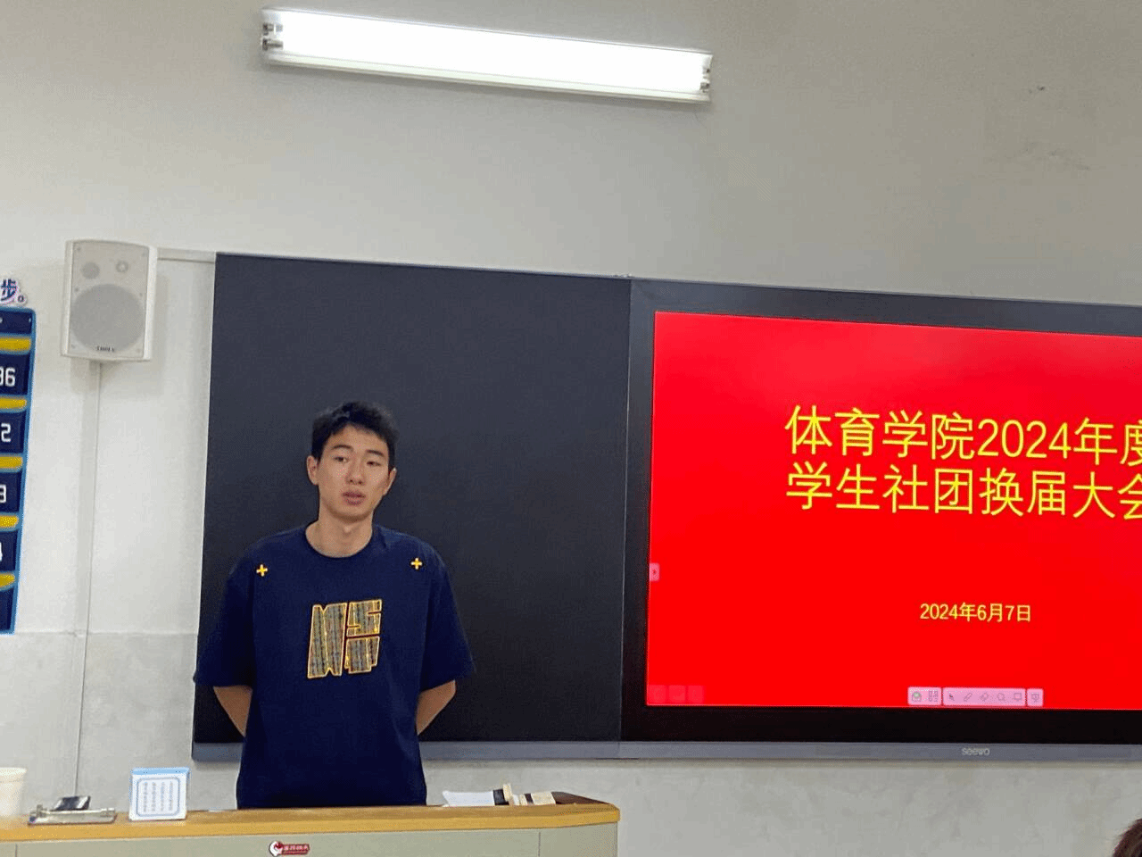 为了体育类社团更好的发展,锻炼同学们的能力,体育学院于2024年6月7日中午12:20在体育学院新馆A109教室举行学生社团换届大会,莅临本次换届大会的评委老师有体育学院团委书记胡杰、各社团指导老师以及社团负责人李若齐。十个社团社长以及各社团候选人参加本次换届大会。
