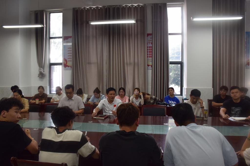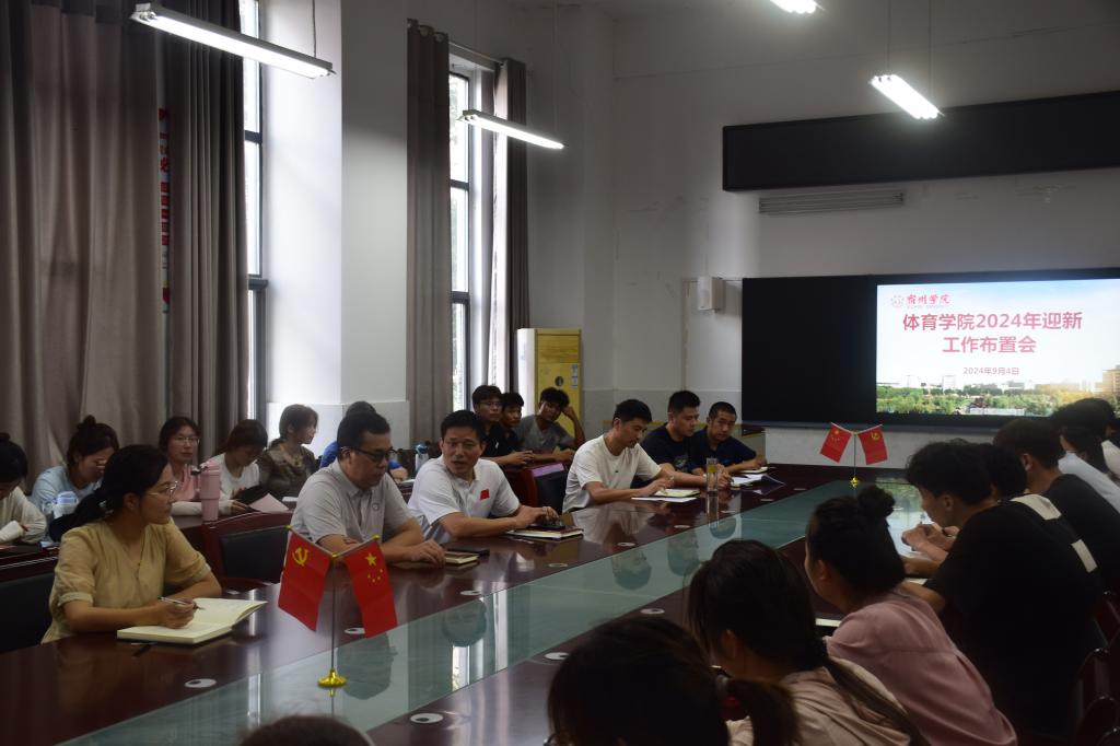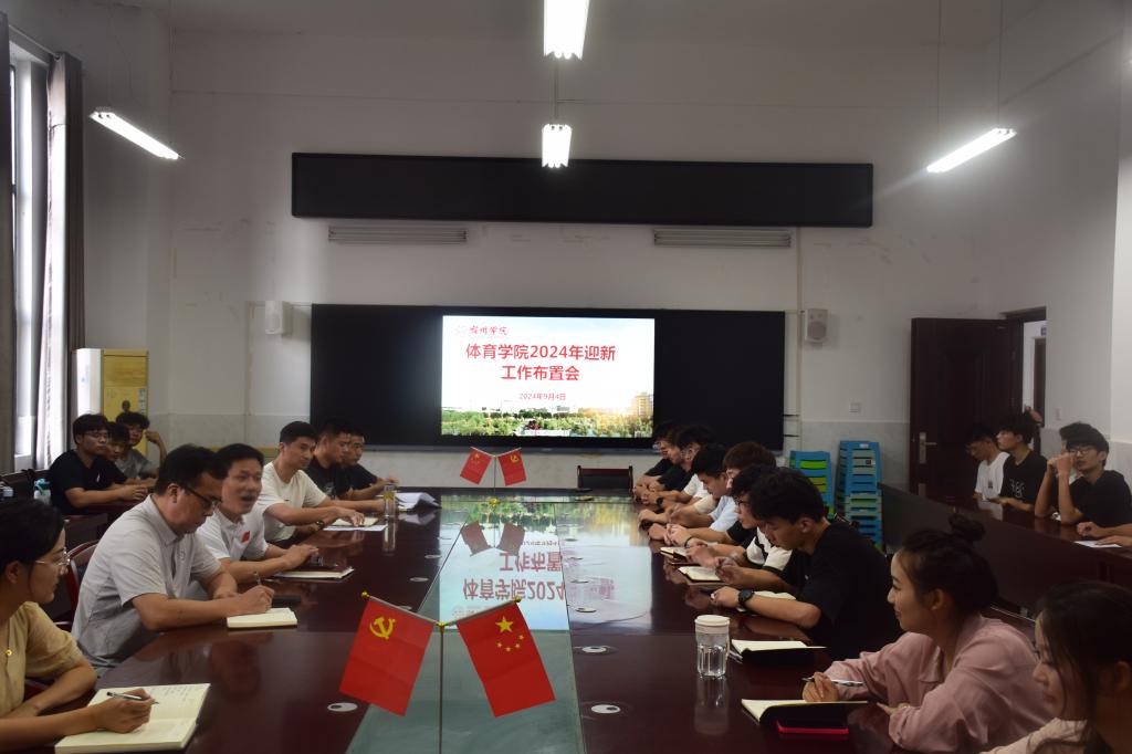 流光溢彩迎新生,心心连心齐飞扬。为迎接2024级新生的到来,給新生营造一个和谐、舒适、温馨的校园氛围;体育学院2024年迎新工作布置会于2024年9月4日下午16点30分在体育学院A104会议室顺利召开。出席本次会议的有体育学院党委书记李高、体育学院党委副书记王德玉、团委书记胡杰、新生辅导员刘天行、江晓翔、王会敏,以及参与工作的学生会和迎新志愿者成员。