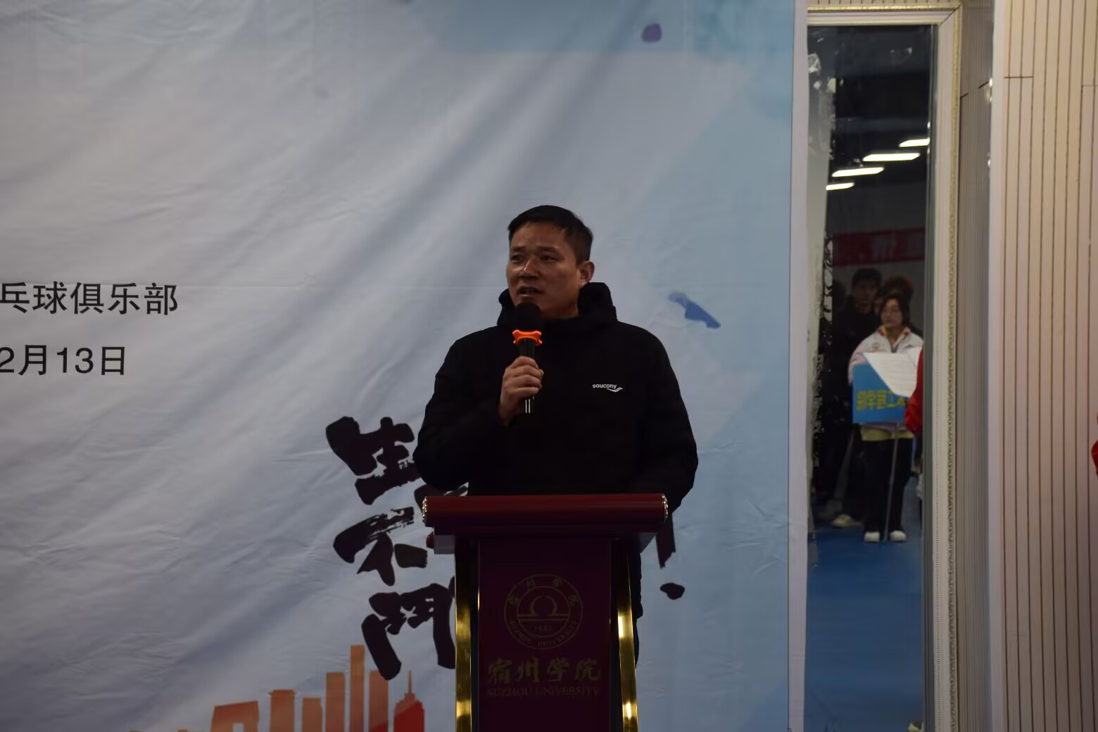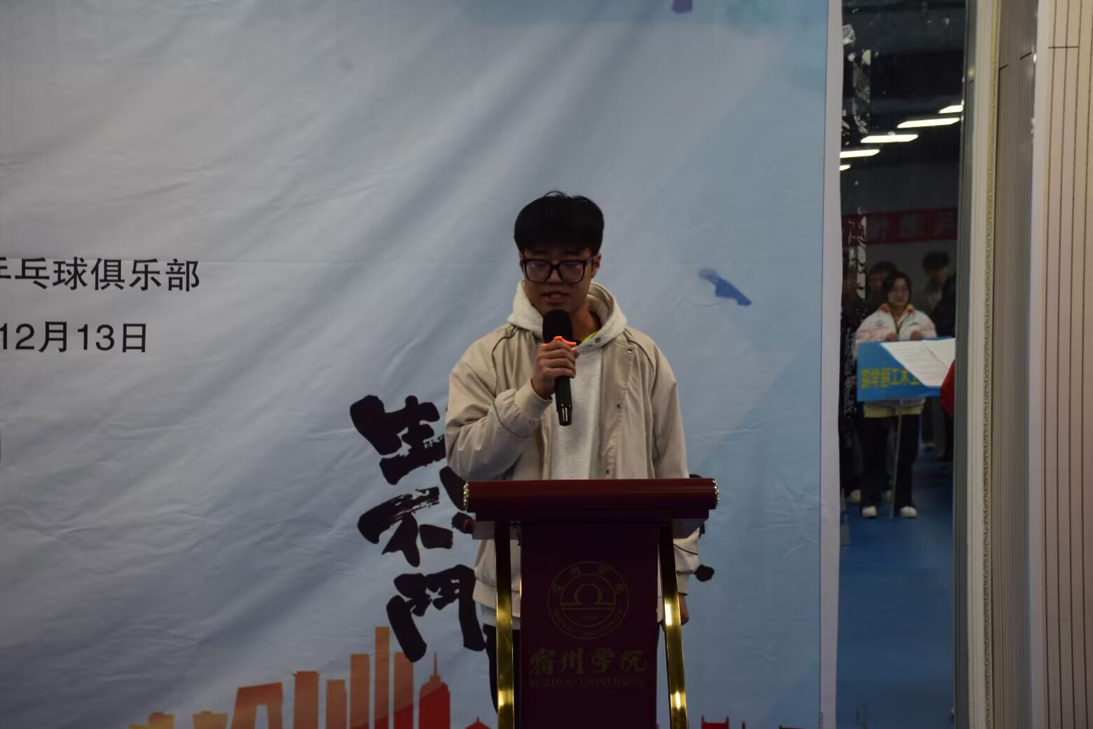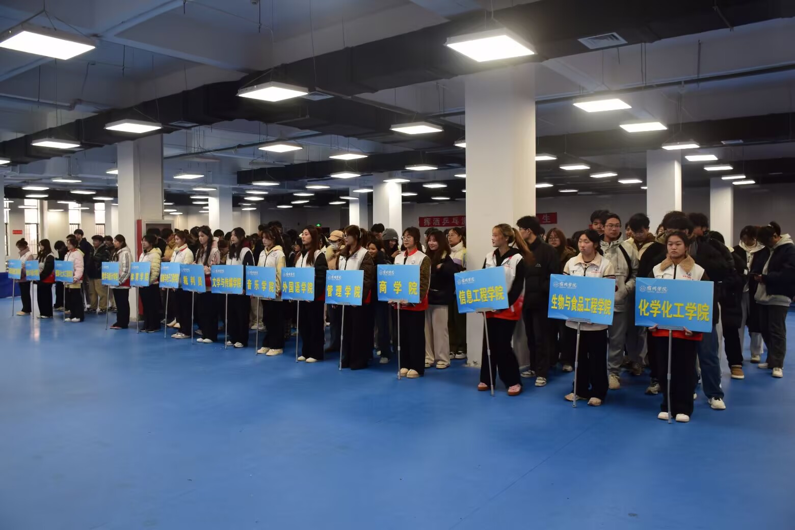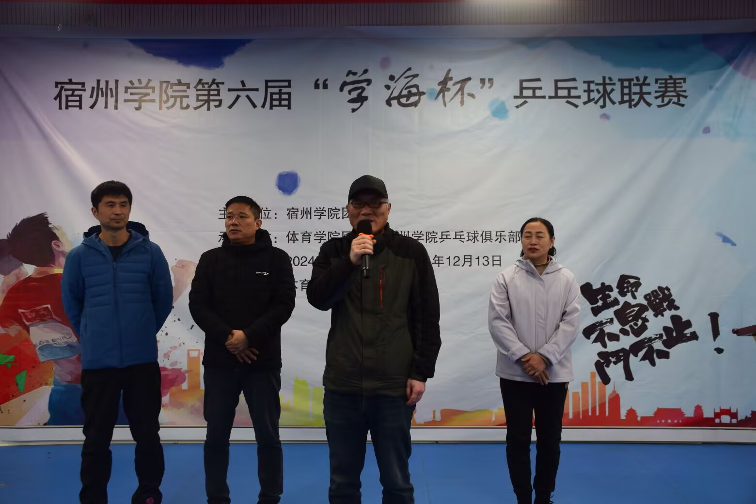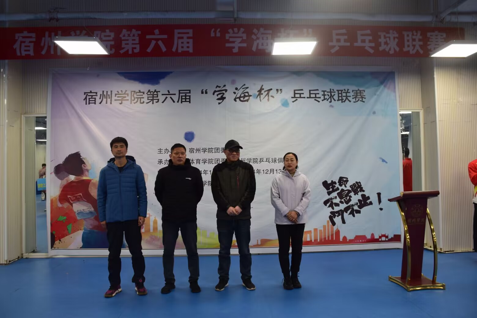 为缓解大学生的学习压力,提高同学们的身体素质,展现大学生青春活力的精神风貌,丰富同学们的课余文化生活,进一步推动校园乒乓球的发展,宿州学院第六届“学海杯”乒乓球联赛开幕式于2024年11月27号中午12时30分在体育学院乒乓球馆举行,参加本次开幕式的有体育学院党委书记李高、体育学院院长白明、体育学院团委书记胡杰、裁判长老师张荣华以及各学院参赛代表队。