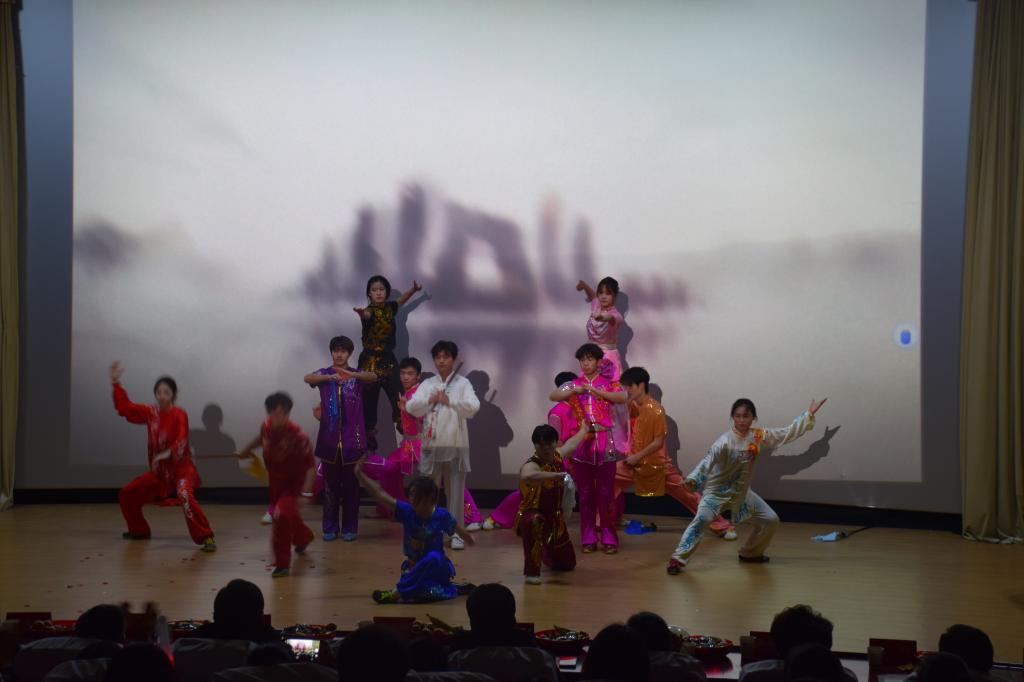 其中,歌曲类节目深情动人,既有表达对新年美好祝愿的《上春山》,也有充满青春活力的《歌曲串烧》;舞蹈类节目则以其独特的魅力和创意赢得了观众的阵阵掌声,如现代舞《sneakers》和民族舞《异域风情》等;武术表演尤为引人注目;节目《武韵飞扬》中学生们身着练功服,展示了太极拳、长拳等多种武术套路,动作流畅有力,赢得了现场观众的阵阵掌声;语言类节目则以幽默诙谐的方式,通过舞台剧和相声等形式,传递了积极向上的正能量,为晚会增添了不少欢声笑语。