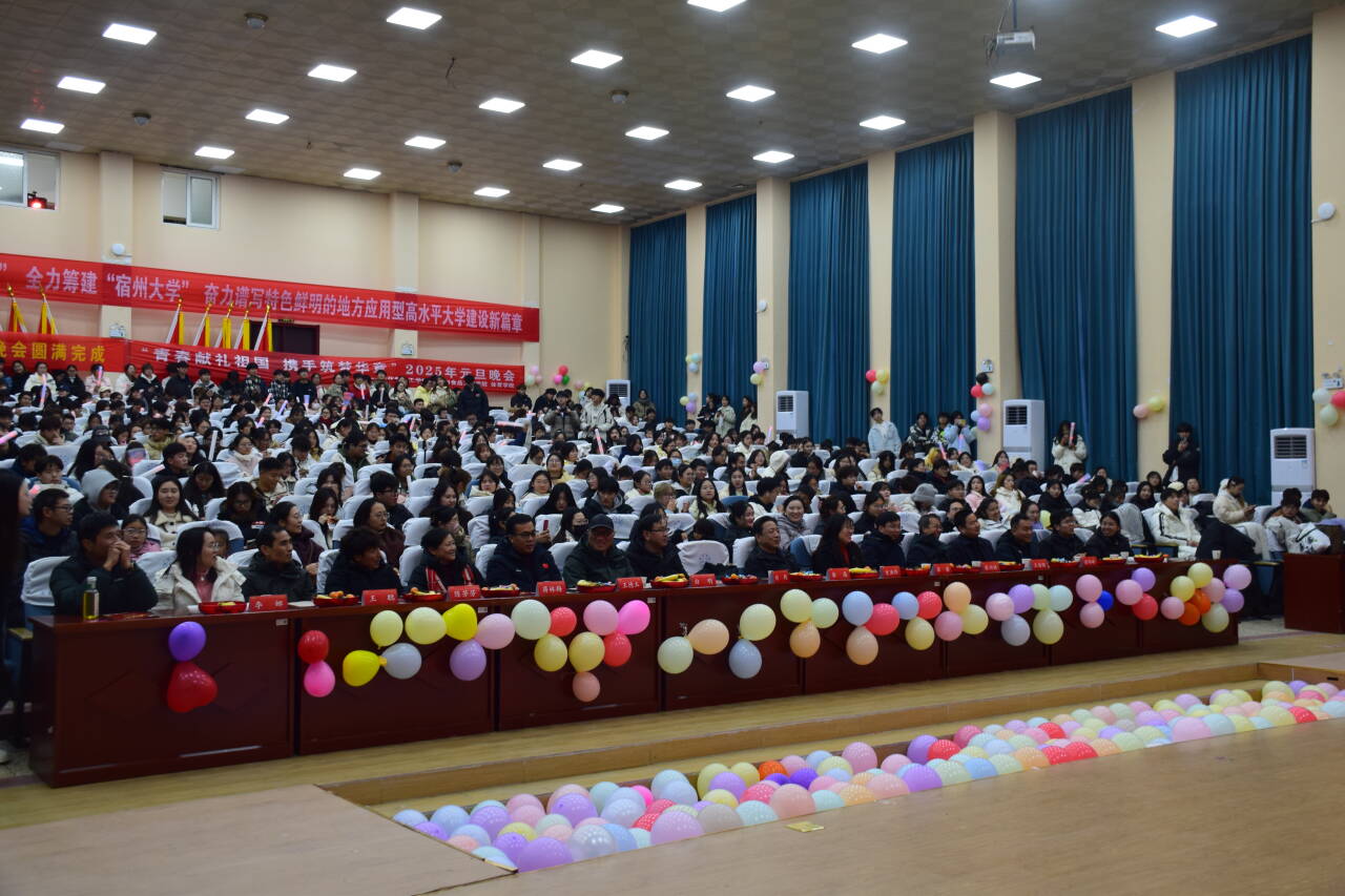 2024 年 12 月 20日晚,宿州学院大学生活动中心内灯火辉煌、欢声笑语,一年一度的元旦晚会在此隆重举行。宿州学院化学化工学院、生物与食品工程学院、体育学院全体师生齐聚一堂,共同告别过去一年的辛勤耕耘,迎接新年的璀璨曙光,在一场场精彩绝伦的表演中开启对未来的美好憧憬。