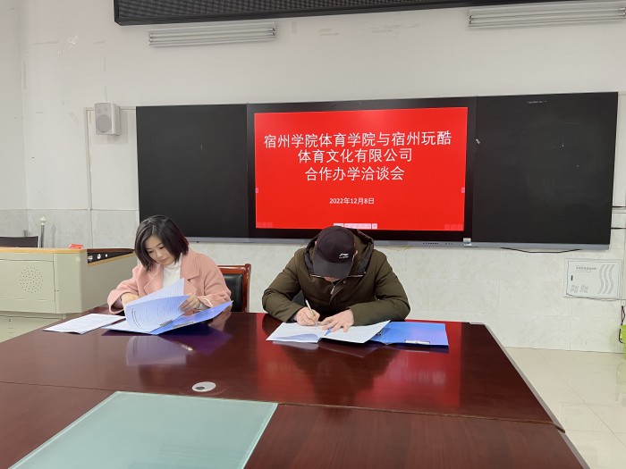 周美倩介绍了宿州玩酷体育文化有限公司的发展历程、经营业绩、企业发展愿景以及在校企合作方面取得的成果。并对体育学院取得的成绩给予了高度评价,表达了本次合作的诚意,希望通过合作办学共同培养高素质、高技能水平的体育人才,实现学生、学校、企业三方共赢。双方就合作办学的细节进行了深入洽谈,在人才培养、合作预期等方面达成了高度的共识,现场签署了合作办学协议。