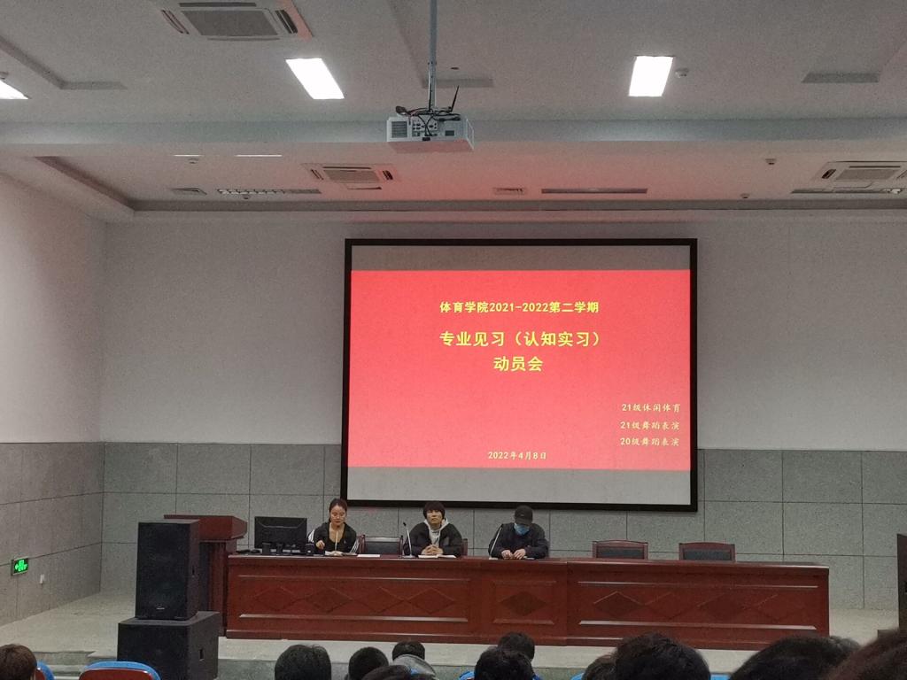 为进一步做好专业教学实践工作,推进我院见习工作的顺利开展,体育学院于4月8日下午在体育馆多功能报告厅开展20级舞蹈表演、21级舞蹈表演和21级休闲体育专业见习动员会。体育学院院长白明、副院长陈芳芳、教研室主任、专业负责人见习指导老师和见习生参加了本次动员大会。会议由见习实训中心主任张丽萍主持。