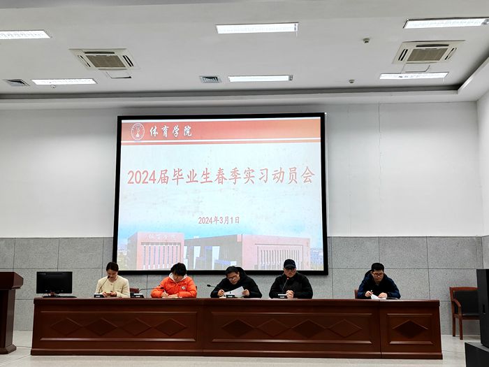 为进一步提升体育学院人才培养水平和就业质量,全面做好2024届毕业生春季实习工作,贯彻落实学校高质量就业要求,确保毕业生毕业实习工作顺利开展,有效引导学生清晰认识自身就业方向,切实提高学生就业竞争力和社会适应能力。体育学院于3月1日在体育馆报告厅B112举行2024届毕业生春季实习动员会。体育学院党委书记李高,党委副书记、院长白明,副院长陈芳芳、实习实训中心主任张丽萍、体育教育教研室主任徐光辉,以及2020级学生参加了会议,动员大会由张丽萍主持。