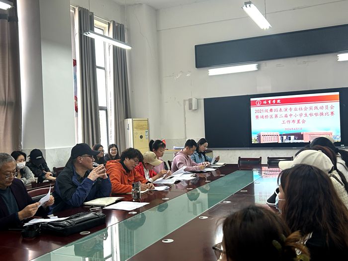 为进一步做好2021级舞蹈表演专业(体育舞蹈和健美操方向)社会实践工作,提高学生实践能力,扎实推进我院实践工作的顺利开展。体育学院于4月1日下午,在体育馆A104会议室召开了2021级舞蹈表演专业社会实践动员会暨埇桥区第二届中小学生啦啦操比赛工作布置会。体育学院党委副书记、院长白明,体育学院教学副院长陈芳芳,舞蹈表演专业负责人刘卫东,休闲体育教研室主任刘明龙、副主任张开媛,实习实训中心主任张丽萍,指导教师李茹,以及2021级舞蹈表演专业全体学生参加了本次会议,会议由实习实训中心教师曹永珍主持。