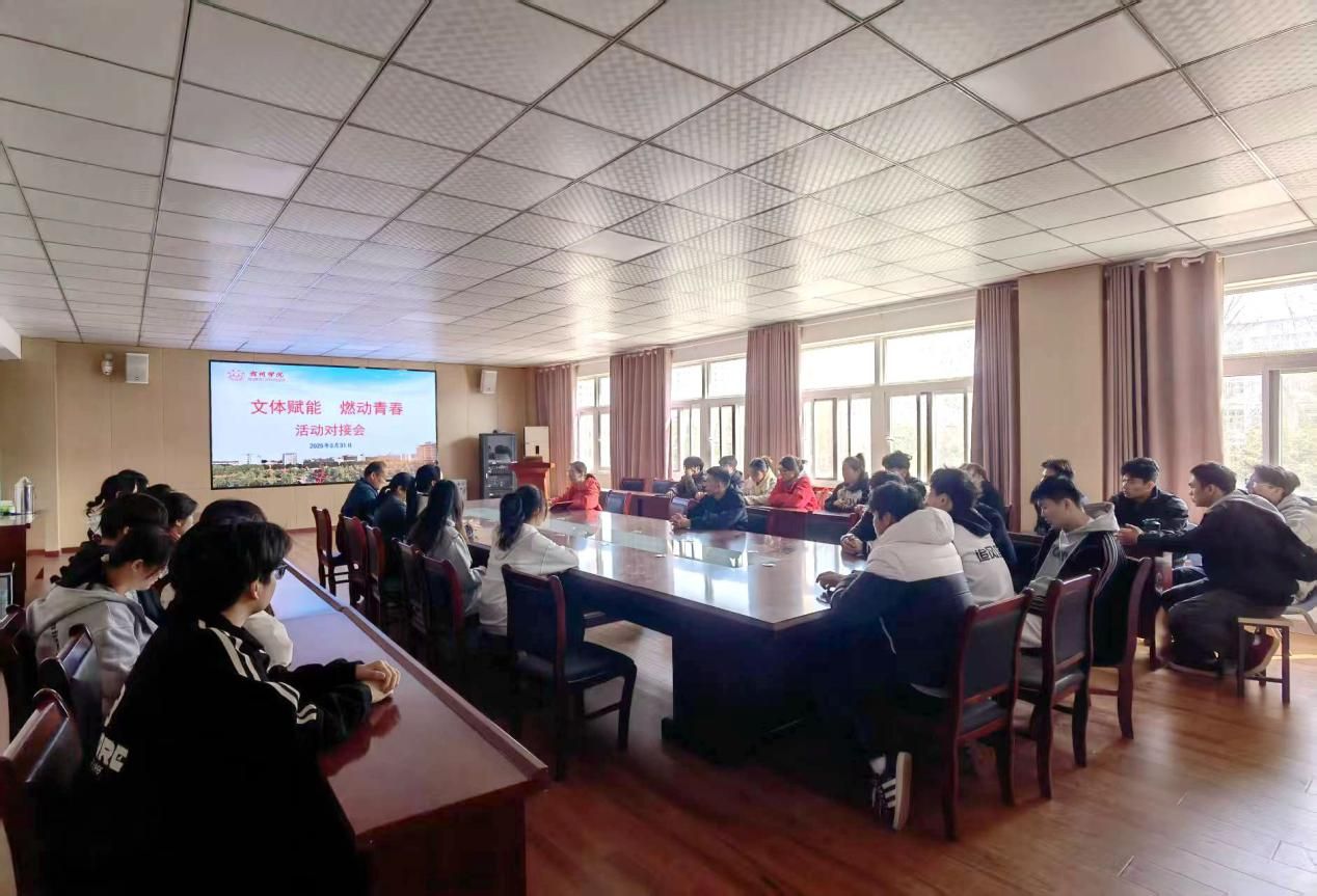 为进一步做好体育学院2022级休闲体育专业实习工作,提高学生实践能力,同时也为深化跨学科交流,激发学生创新活力,3月31日下午,由体育学院2022级休闲体育专业实习团队和文学与传媒学院联合举办的“文体赋能 燃动青春”活动对接会在文学与传媒学院会议室顺利举行。本次活动以“专业实践+创意策划”为核心,旨在通过文体融合的形式,为校园文化活动注入新动能。文学与传媒学院党委副书记、纪委书记刘影,团委书记王磊,体育学院休闲体育专业负责人和指导教师张开媛,体育学院2022级休闲体育专业全体学生及文传学院2024级各班班长参加了会议。