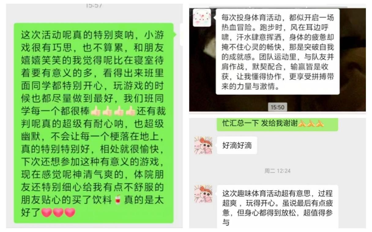 活动结束后,参与的学生纷纷表示收获颇丰。文学与传媒学院2024级王同学说:“这次活动让我意识到,体育不仅是体力活动的较量,更是团队凝聚力的试金石。从最初的手忙脚乱到最后的配合无间,我们共同成长,未来,我也会带着这股团结的力量迎接更多挑战。”张同学则表示:“体育学院的学长学姐们组织得很专业,活动规则讲解清晰,现场把控到位,让我们玩得既开心又安全。”李同学说:“在活动中,不仅让我们锻炼了身体,更拉近了彼此的距离,还让我深刻领悟到团队合作的力量能战胜一切困难。”