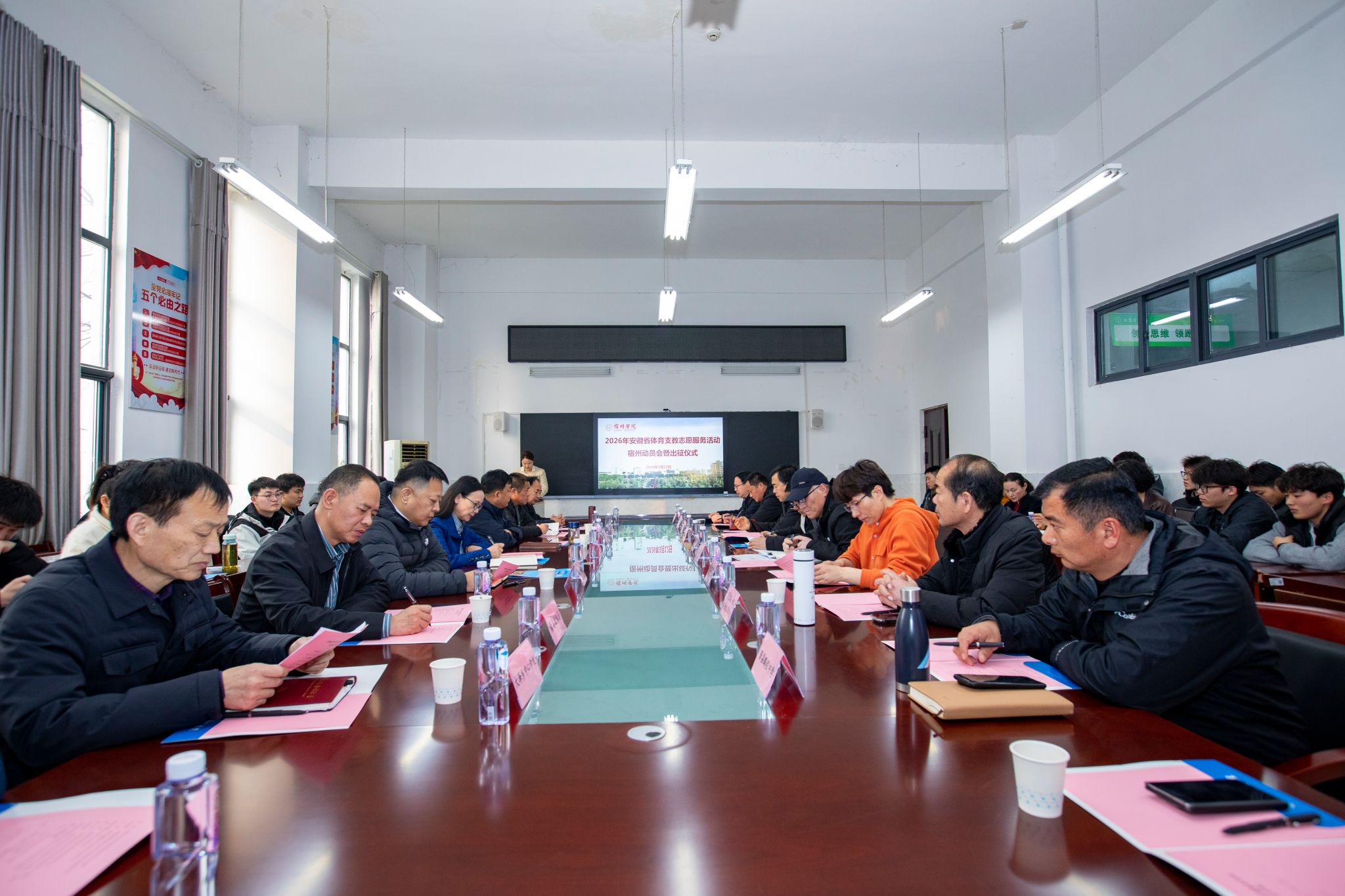 3月12日,2026年安徽省体育支教志愿服务活动宿州动员会暨出征仪式在宿州学院体育学院举行。宿州市教体局副局长于枫、竞技科负责人武云启,宿州学院体育学院领导班子,埇桥区、灵璧县、萧县教体局分管负责人、5 所受支教学校负责人、宿州学院指导教师及20名志愿者参会,会议由李高主持。