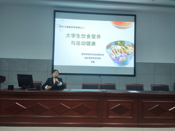 为了进一步落实校体育运动委员会联合体育学院举办的《体育与健康》系列讲座活动,提高全校师生健康、科学地健身意识,养成其日常锻炼和自我监督习惯。2021年4月28日下午,体育学院汤盈老师在体育学院报告厅作了体育与健康系列讲座之三“大学生饮食营养与运动健康”,吸引了我校2020级公共体育100多位学生现场聆听。