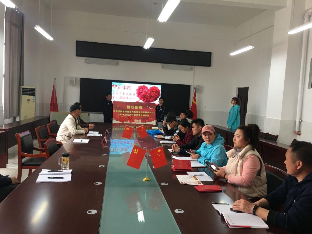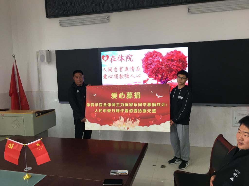 体育学院党委决定对其实施捐赠以缓解其经济压力,2021年3月17日由体育学院团总支牵头在会议室为陈家乐同学举行爱心募捐活动,在体育学院副院长白明宣读了倡议书后,党委书记宋红军带头捐款,随后体育学院老师们慷慨解囊献爱心,各班级的代表也现场把钱投入捐款箱内。