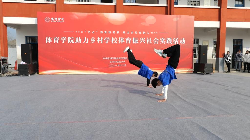 本次活动包括义务支教、爱心捐赠、文体表演、师生现场交流四个部分。活动开始前,双方进行了交流座谈会,会议由李高主持,支河乡城孜小学校长李明介绍与会嘉宾并致欢迎辞。李明向大家介绍了城孜小学的历史沿革,并向宿州学院体育学院此次的指导与帮扶表示感谢。白明介绍了本次社会实践活动的意义、内容安排等事项,并就后续进一步合作交流了意见。会后,利用大课间时间,体育学院学生现场进行了“加油鸭”课间拉丁舞操教学,伴随着音乐,由易到难,由简到繁,层层深入,寓教于乐,充分调动广大学生学习的积极性,真正做到了教有所得,学有所乐。义务支教之后,紧接着进行了“心系乡村 爱心助学”捐赠仪式,捐赠仪式由李高主持。李高介绍出席嘉宾领导,李明和白明分别作了讲话。随后,院领导向城孜小学捐赠了科普读物和体育用品。捐赠仪式结束后,在指导教师精心组织、编排下,紧扣本次实践活动主题精神,以摩登舞、拉丁舞、健美操、武术等形式,为城孜小学带来了一场精彩绝伦的文体盛宴。八人踏板《super girl》、爵士舞《动感女孩》、五人竞技操《Boom Boom Boom》、街舞《武林风》、摩登舞《万疆》、武术《中国骄傲》、健美操《挥洒青村》、集体舞《信仰》等节目,使城孜小学师生们目不暇接,忍不住拍手叫好。在演出间隙,还进行了现场党史知识有奖竞猜活动,主持人设置了如“今年是中国共产党建党多少周年”、“社会主义核心价值观的内容是什么”等问题,由小学生们进行抢答。最后,在城孜小学校领导带领下,体育学院师生参观了城孜村乡村大讲堂,了解了城孜小学校园变化。
