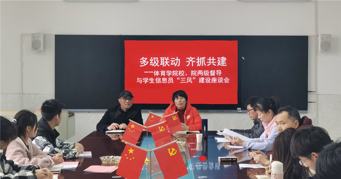 2022年3月31日下午,体育学院在A104会议室召开了‘多级联动 齐抓共建’——体育学院校、院两级督导与学生教学信息员“三风”建设座谈会。体育学院院长白明、教学副院长、院督导组组长陈芳芳、校督导委员会委员王瑞芳、院督导员李茹、张炳祥、徐光辉、教务员王彦银以及体育学院学生教学信息员参加了此次会议,会议由陈芳芳主持。