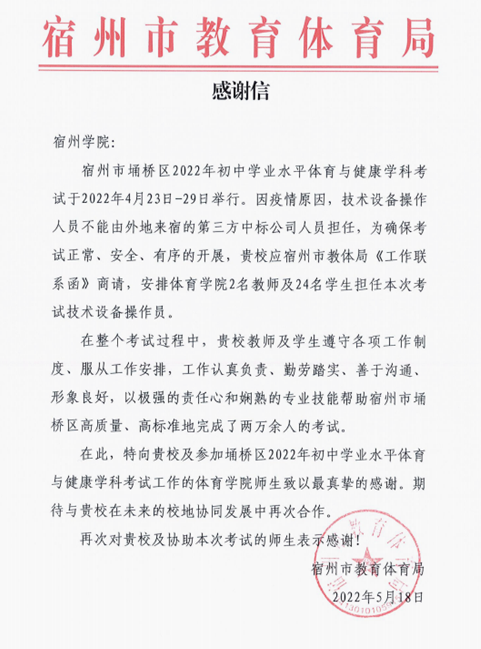 近日,宿州学院收到宿州市教育体育局发来的感谢信,专门就宿州学院协助宿州市埇桥区2022年初中学业水平体育与健康学科考试工作表示感谢。