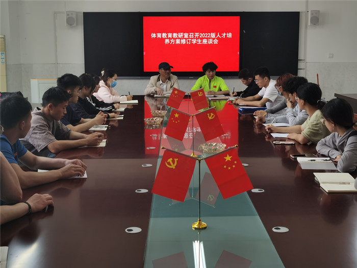 为认真做好2022版本科人才培养方案修订工作,2022年5月20日中午,体育学院在会议室A104召开2022版体育教育专业(师范类)本科人才培养方案修订学生意见征求座谈会。体育学院党委副书记、院长白明,教学副院长陈芳芳,体育教育教研室主任徐光辉,副主任宋梅以及2018、2019、2020级部分优秀在校生参加了座谈会。