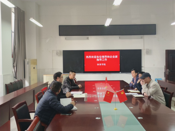 为深入贯彻党的二十大精神,落实宿州市“4510”校地联合科创行动要求,2023年3月27日下午,宿州市卫生健康委员会党组成员 副主任李斌、领英体育发展有限公司总经理王涛、宿州玩酷体育文化有限公司总经理刘冰于宿州市“百强”企业进校园活动科创成果路演后来体育学院洽淡校地校企合作。体育学院党委书记李高、党委副书记 院长白明、党委副书记王德玉参加会议。会议由白明主持。