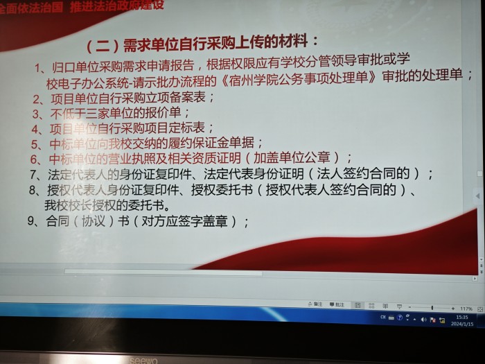 聂鹏首先对我国法治建设的主要内容进行了深入解读,并从我国宪法的形成和发展、宪法的地位和基本原则、加强宪法实施与监督等方面进行了全面阐释。随后,对全体教师较为关注的宿州学院OA系统的使用及合同管理办法中合同的签订和履行,包括合同的起草、审批、执行和结束等环节进行了详细的讲解,尤其对合同的保密、违约和处罚关键点进行了强调。