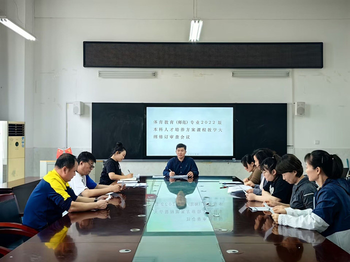 2022年8月17日13:00在体育学院会议室A104召开体育教育(师范)专业2022版本科人才培养方案课程教学大纲修订审查会议。会议由体育学院体育教育教研室主任徐光辉及体育教育专业专任教师共同参与。
