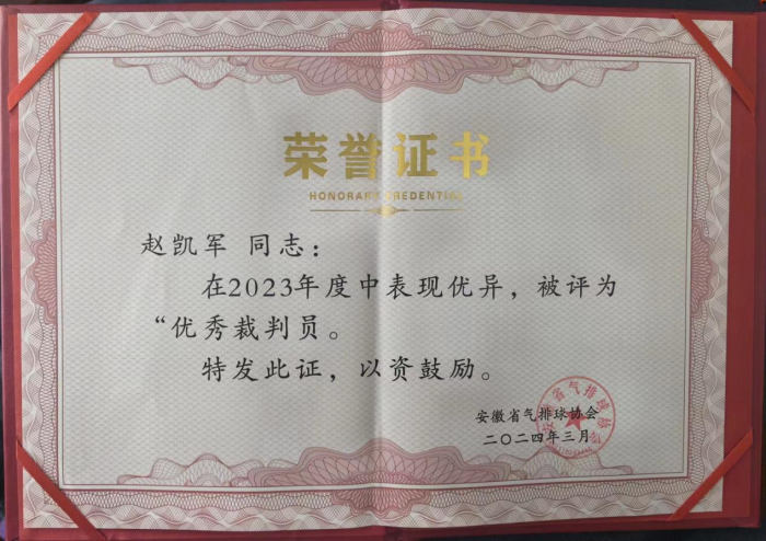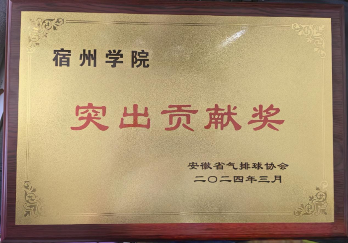宿州学院作为安徽省气排球运动的重要参与者、推动者,在过去一年积极服务宿州市市运会、承办安徽省气排球裁判员培训、气排球比赛等工作,荣获2023年度“突出贡献奖”荣誉,体育学院教师赵凯军被评为年度“优秀裁判员”称号。这些荣誉的获得,不仅是对宿州学院办学质量的认可,更是对学院应用型本科高校发展的高度肯定,也进一步彰显了校地合作、校企合作的丰硕成果。