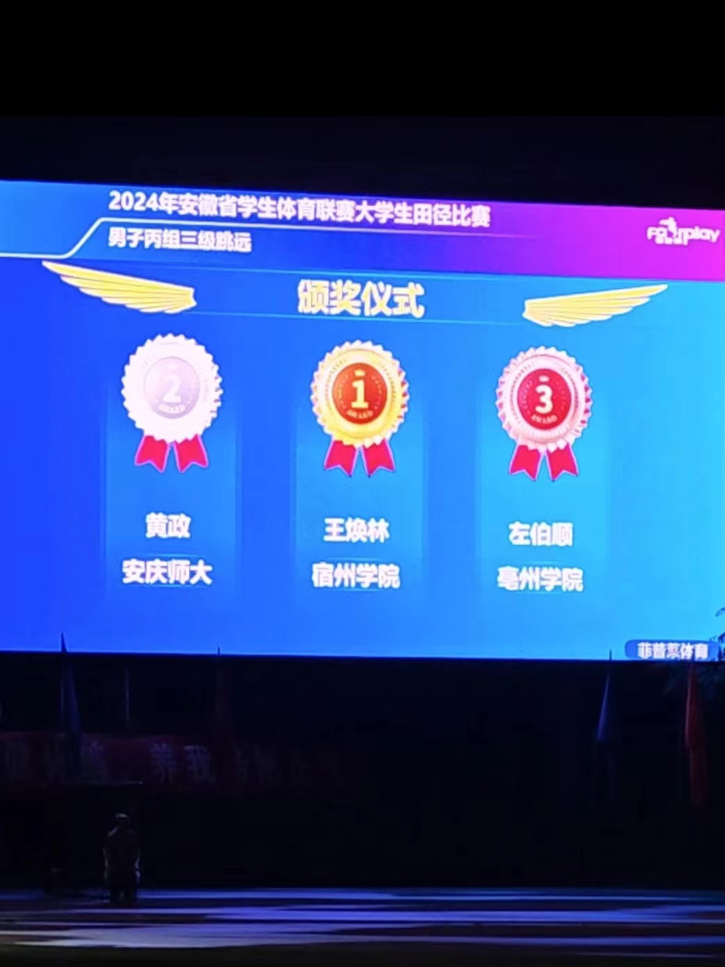 经过五天紧张激烈的角逐,宿州学院田径代表队取得1金1银1铜的佳绩,另外还获得二等奖2项,三等奖2项。其中男子丙组三级跳远选手王焕林跳出14.57米的好成绩,力压一众高水平运动员,荣获金牌;男子丙组标枪选手胡俊和徐伟不畏强敌,奋勇拼搏,最终分别取得亚军和季军,实现同台领奖。