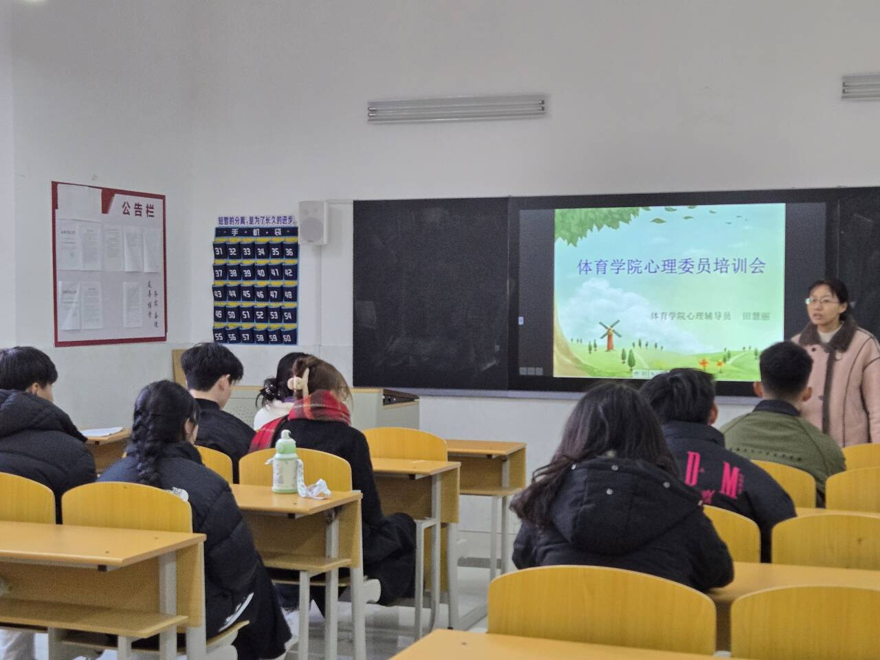 为了提升各班心理委员的心理健康水平和工作能力,2024年11月26日体育学院召开心理委员培训会,心理辅导员田慧丽老师主讲,大一至大三各班心理委员参加。