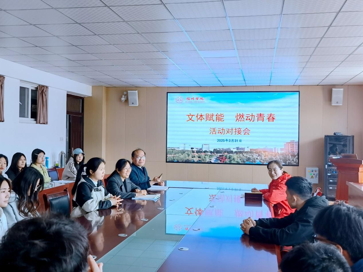 为进一步做好体育学院2022级休闲体育专业实习工作,提高学生实践能力,同时也为深化跨学科交流,激发学生创新活力,3月31日下午,由体育学院2022级休闲体育专业实习团队和文学与传媒学院联合举办的“文体赋能 燃动青春”活动对接会在文学与传媒学院会议室顺利举行。本次活动以“专业实践+创意策划”为核心,旨在通过文体融合的形式,为校园文化活动注入新动能。文学与传媒学院党委副书记、纪委书记刘影,团委书记王磊,体育学院休闲体育专业负责人和指导教师张开媛,体育学院2022级休闲体育专业全体学生及文传学院2024级各班班长参加了会议。